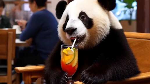 Неожиданно! Панду в кафе угостили фруктовым коктейлем.