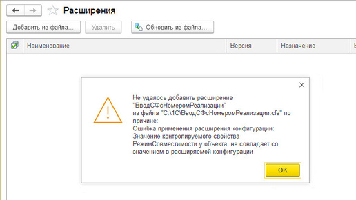 1С 8 Ошибка совместимости при загрузке расширения в базу