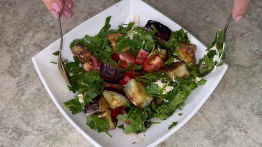 Салат с хрустящими баклажанами, сливочным сыром, помидорами и петрушкой. Под соево-чесночным соусом.
