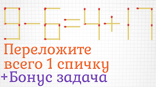 Переложите всего 1 спичку так, чтобы получить верное решение, плюс бонусная задача на логику