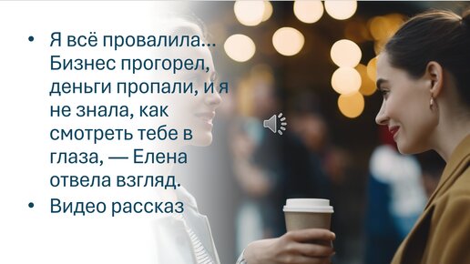Я всё провалила... Бизнес прогорел, деньги пропали, и я не знала, как смотреть тебе в глаза, — Елена отвела взгляд.Видео рассказ