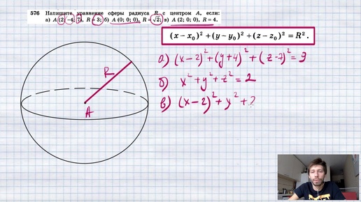 №576. Найдите уравнение сферы радиуса R с центром А, если: а) А (2; -4; 7), R = 3; б) А (0; 0; 0),