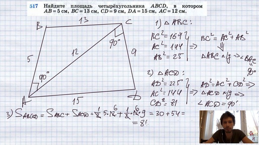 №517. Найдите площадь четырехугольника ABCD, в котором АВ = 5 см, ВС = 13 см, CD = 9 см, DA =15 см