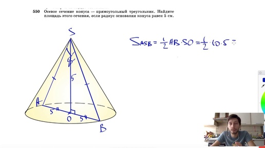 №550. Осевое сечение конуса — прямоугольный треугольник. Найдите площадь этого сечения, если
