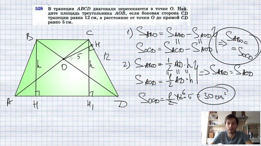 №528. В трапеции ABCD диагонали пересекаются в точке О. Найдите площадь треугольника АОВ, если боков