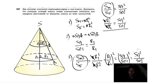 №557. Две секущие плоскости перпендикулярны к оси конуса. Докажите, что площади сечений конуса