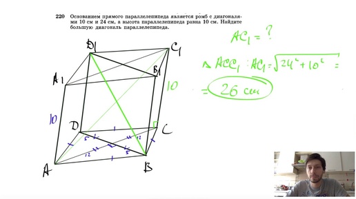 №220. Основанием прямого параллелепипеда является ромб с диагоналями 10 см и 24 см, а высота