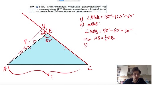 №259. Угол, противолежащий основанию равнобедренного треугольника, равен 120°. Высота, проведенная