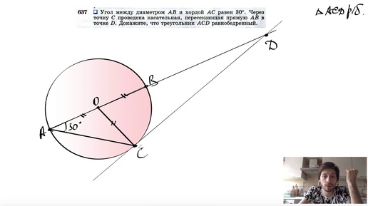 №637. Угол между диаметром АВ и хордой АС равен 30°. Через точку С проведена касательная