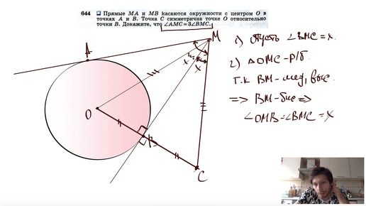 №644. Прямые МА и MB касаются окружности с центром О в точках А и В. Точка С симметрична точке О