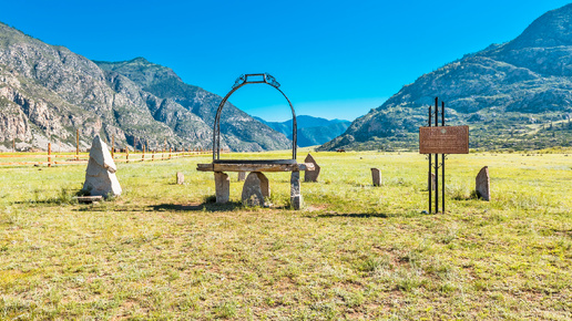 Памятник стремени, большой древний курган в урочище Кур-Кечу у реки Катуни. Онгудайский район горного Алтая.
