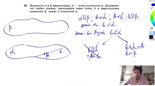 №56. Плоскости α и β параллельны, А — точка плоскости α. Докажите, что любая прямая,