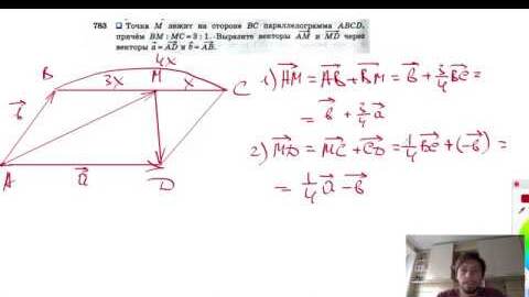 №783. Точка М лежит на стороне ВС параллелограмма ABCD, причем ВМ:МС=3:1. Выразите