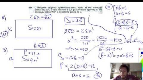 №454. Найдите стороны прямоугольника, если: а) его площадь равна 250 см2, а одна сторона в 2,5 раза
