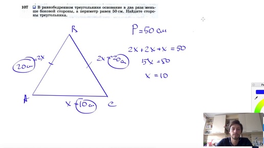 №107. В равнобедренном треугольнике основание в два раза меньше боковой стороны, а периметр