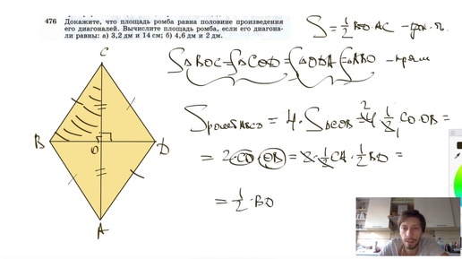 №476. Докажите, что площадь ромба равна половине произведения его диагоналей. Вычислите