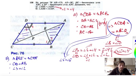 №139. На рисунке 76 АВ = CD, AD = ВС, BE — биссектриса угла ABC, a DF — биссектриса угла ADC.