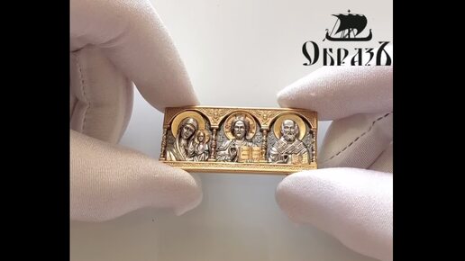 Икона дорожная "Спаситель, Божия Матерь, Николай Чудотворец" с молитвой водителя, серебро 925 пробы с золочением (арт. ИД (СЗ)