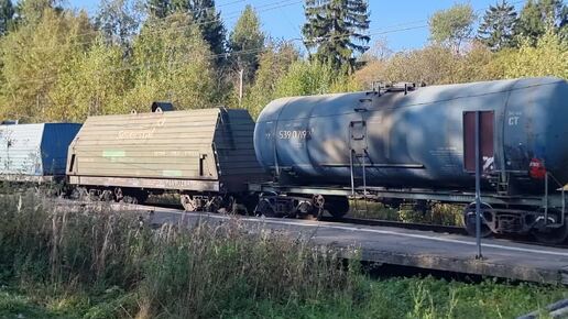 Наблюдаем как товарный железнодорожный состав (поезд) набирает скорость и движется всё быстрее и быстрее.