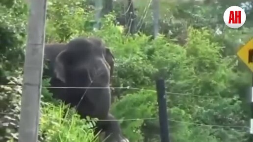 Слон аккуратно проверяет заграждение на наличие электричества, прежде чем пройти препятствие