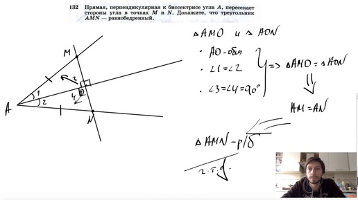 №132. Прямая, перпендикулярная к биссектрисе угла А, пересекает стороны угла в точках М и N