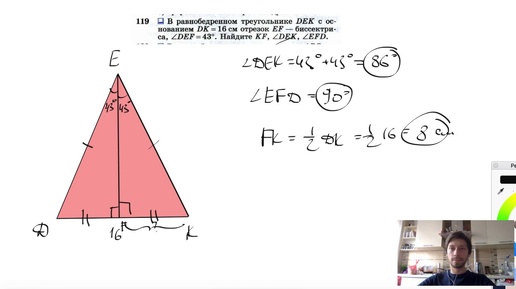 №119. В равнобедренном треугольнике DEK с основанием DK=16см отрезок EF— биссектриса,
