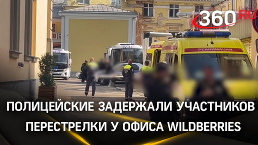 Полицейские грузят в автобус участников перестрелки у офиса Wildberries в бизнес-центре «Романов двор»