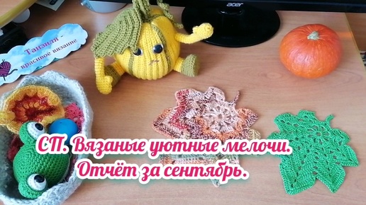СП Вязаные уютные мелочи. Отчёт за сентябрь. Связала корзиночку, игрушку интерьерн. Тыквина, 2 листика клена, вяжу плед. Мои планы.