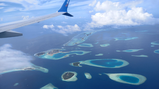 Под крылом самолета райские Мальдивы.