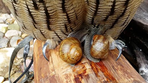 Виноградные улитки пытаются съесть филина Ёлку