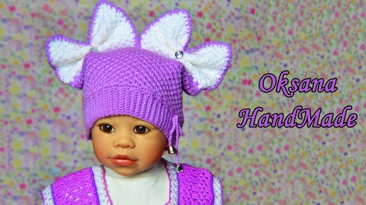 Шапка крючком с ввязанными бантиками. Crochet hat