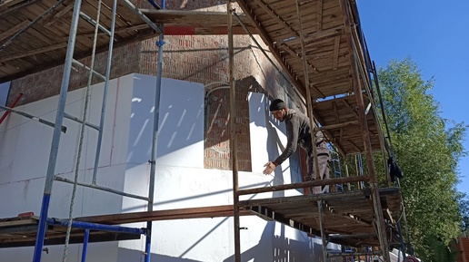 Начинаем утепление фасадов кирпичного частного дома, приклейка пенопласта 150мм и выравнивание стен