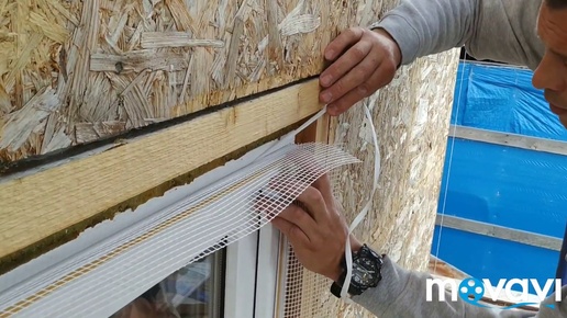 Как приклеить элементы примыкания с сеткой на фасаде каркасного дома, отделка СФТК Мокрый Фасад