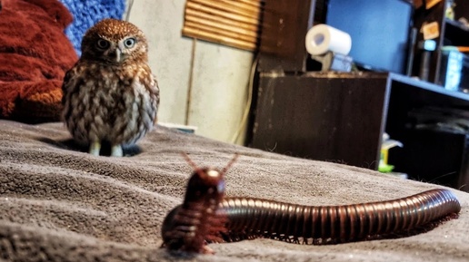 Червяк больше совы! Совёнок Лучик и очень большая многомногомножка! Страшное? Красивое!