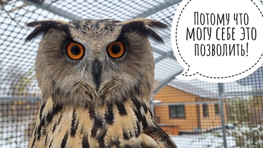Сова филин Ёль сидит довольная под ледяным дождём