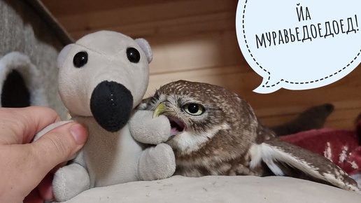 Сыч Лучик получил своего подарочного муравьеда. Кажется,они подружились. Чеши сову и показывай тыквы