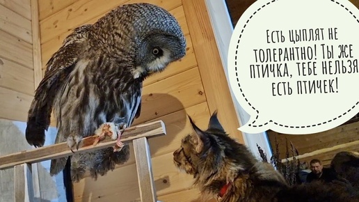 Неясыть Кофи терпит кошку Морошку и отправляется в вольер. Кот Пуаро зашёл водички попить