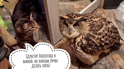 Сова филин Ёлка пришла сохнуть в дом и уютно сидеть на жопоньке, пока я чищу её вольер