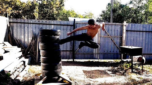 "Макивара" из шин для отработки ударов руками и ногами.