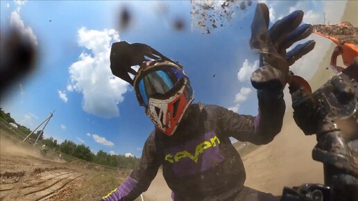 Мотокросс. Жесткий старт. Борьба на треке. Камера на гонщике.