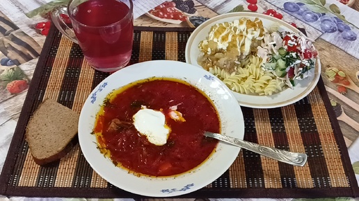 Меню на день: свекольник, мясо по-французски, макароны, салат, омлет, компот и печенье сендвич.