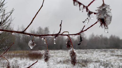 Капельки дождя застывают на ветках. В Подмосковье идет снег с дождем.