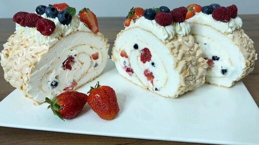 ЭТОТ ОСЕННИЙ ДЕСЕРТ ПРОСТО ТАЕТ ВО РТУ !!! МЕРЕНГОВЫЙ РУЛЕТ С КЛУБНИКОЙ , МАЛИНОЙ и ГОЛУБИКОЙ !!!