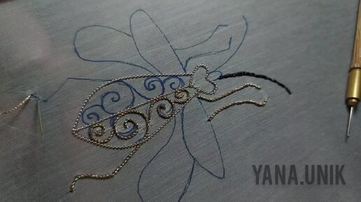 Далее: Мастер-класс Жук с синими крыльями. Часть 3. Вышивка рисунок из золотого витого шнура.