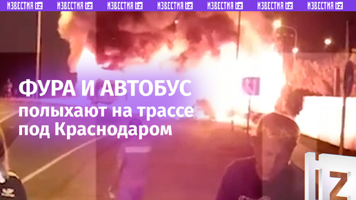 Мощный пожар произошел в результате ДТП под Краснодаром: горят фура и автобус