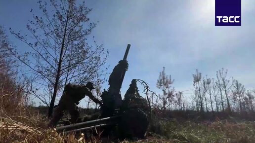 В Минобороны России показали кадры боевой работы расчетов 82-мм автоматических минометов "Василек" в Курской области