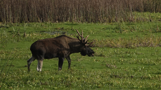 Лось после гона кормится свежей травой на обсохших мелководьях