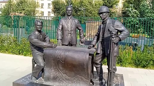Сурский сквер (Сквер строителей) в Волгограде - часть 1: модель универмага и центральная композиция в виде трёх строителей