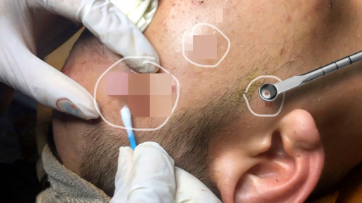 Крупная россыпь воспалённых ГНОЙНИКОВ стреляет фонтаном из виска