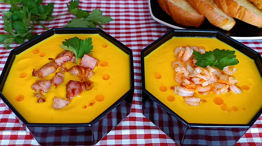 🎃 Тыквенный суп. 2 варианта подачи супа-пюре из тыквы: с подкопченной грудинкой или креветками